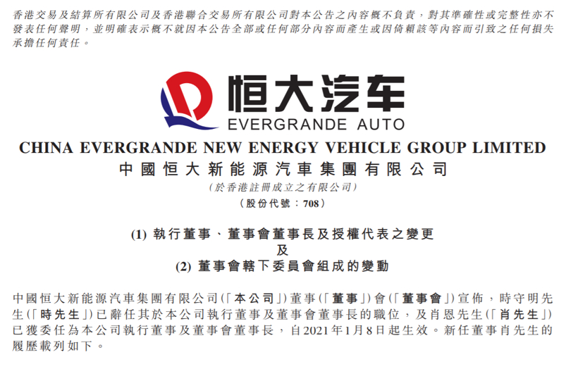 时守明辞任恒大汽车董事长,肖恩接任日前,中国恒大新能源汽车集团有限公司(00708.hk,以下简称恒大汽车)发布公告,由...……