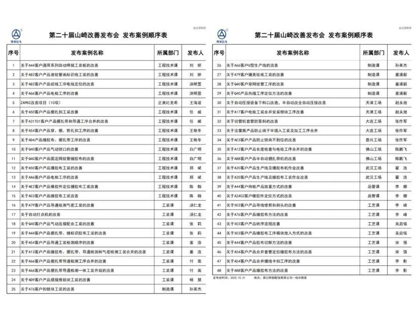 改善发布会由营口阿部配线有限公司制造部部长、公司改善管理委员会主任刘贵春主持。上汽大众汽车有限公司电子电气工程产品工程线束开发部门经理杨俭、原长春藤仓电装有限公司总经理刘伟华教授,原上汽大众有限公司电气科科长、高级工程师王顺兴,天津浩森工贸有限公司董事长王新担任评审专家。