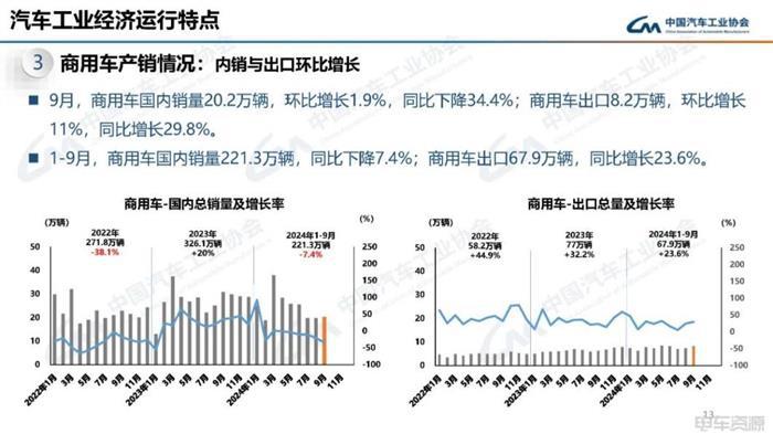 2、9月,商用车共销售28.4万辆,同比下降23.5%;1—9月,商用车共销售289.2万辆,同比下降1.6%;其中,9月新能源商用车国内销量4.8万辆,同比增长9.3%,占商用车国内销量比例为23.8%。