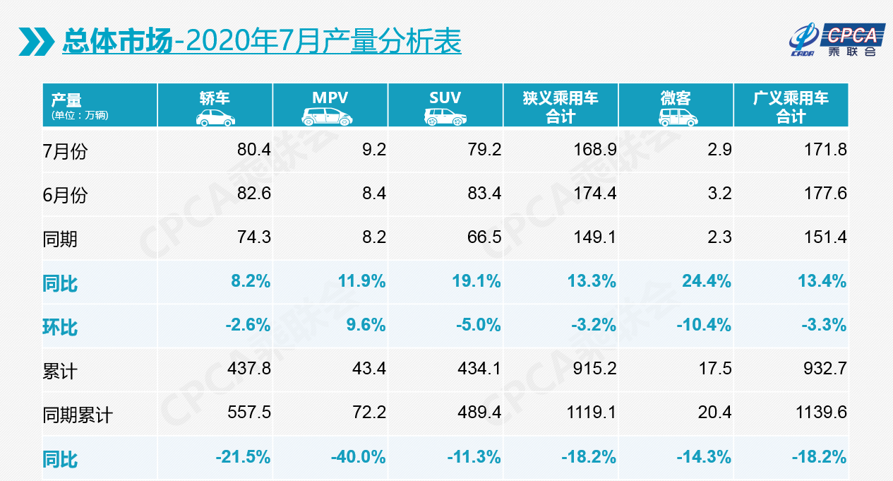 8月11日上午,乘联会发布了7月乘用车产销数据。数据显示,7月狭义乘用车产量为168.9万台,同比增长13.3%;零售销量为159.7万台,同比增长7.7%;批发销量为163.6万台,同比增长7.4%。以上三个指标数据均呈正增长,且零售销量高于批发销量,整体表现好于预期,预示着下半年车市迎来“开门红”。