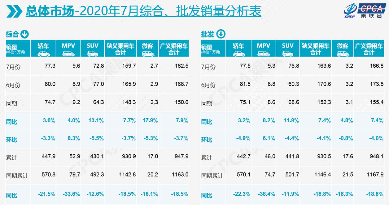 7月乘用车零售和批发销量分析表(图表来源:乘联会)