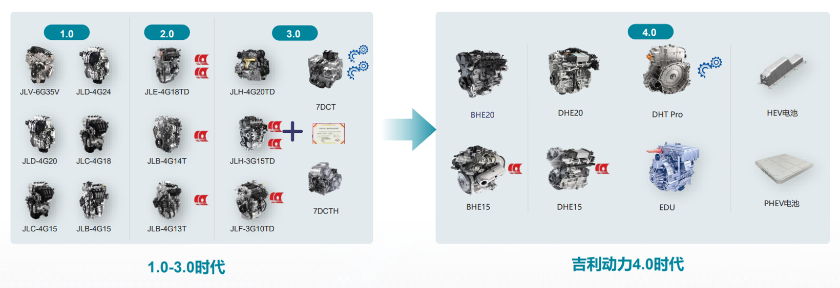 我们吉利动力历经了四代产品迭代,截至今年,我们连续9年获得中国芯十佳动力和3次世界十佳变速器,前两代以技术跟随为主,在3.0产品上,我们开始混合动力量产尝试,总体来说还是通过平台化、通用化电气化,兼容传统动力/BSG/HEV/PHEV/REEV以及E85灵活燃料引用,包括轻混、插电混动和增程已全面推向市场了,第一代混动BSG和PHEV主要在国内市场,领克01 PHEV和HEV已经在欧洲市场上市,增程模式的混动主要应用在伦敦出租车上,E85针对泰国市场在当地上市。 从第四代开始,全面聚焦混动,包括今年推出的DHE和BHE系列混动专用发动机,以及DHT系列混动专用变速器。