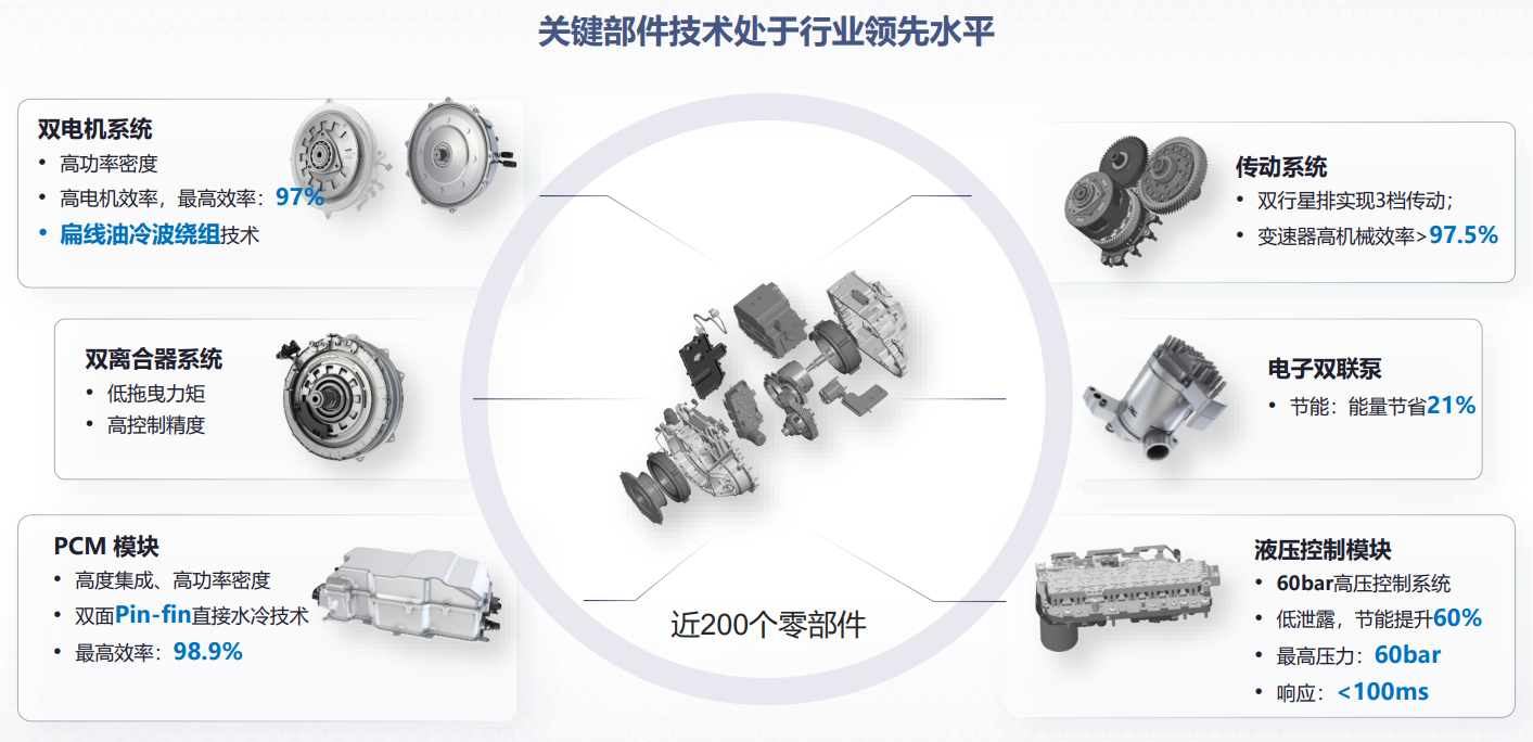 首先我们来看下我们这款混动的最关键的部分,混动变速器DHT-Pro,可实现电驱3档+发动机3档,