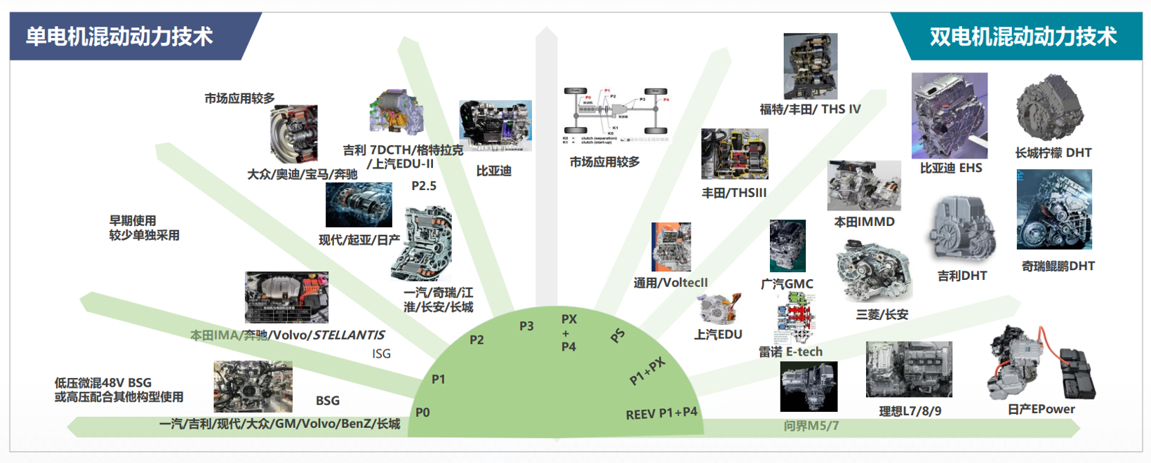 首先我简要介绍一下混动技术发展现状,1997年丰田首次推出Prius混动到今天,出现了各式各样的混动架构,可以说是神仙打架、百花齐放。影响比较大的总体来说分为4类,丰田PS功率分流型,本田串并联型、E-Power增程型、大众P2构型,我们国内主机厂长期以来基本上跟随或者观望或学习的状态,
