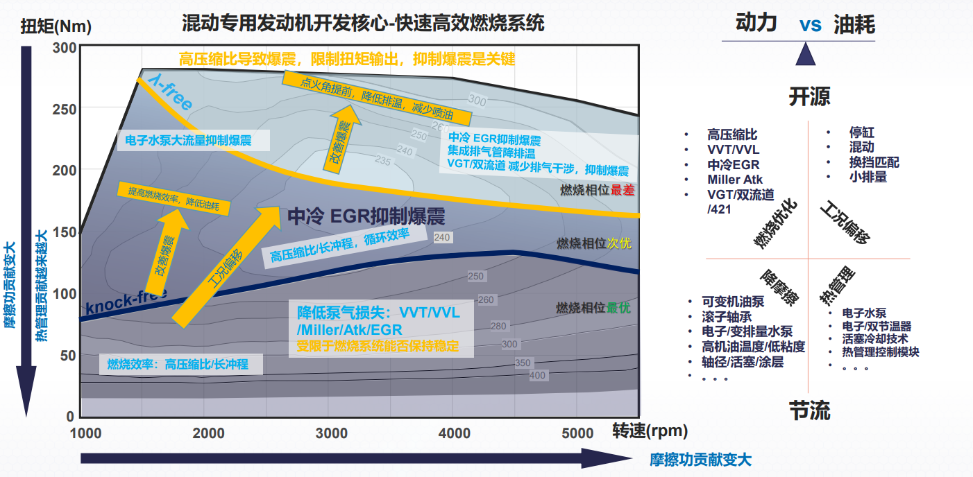首先我简要介绍一下混动专用发动机的开发技术逻辑,本质就是通过开源节流平衡动力与油耗,传统动力动力优先兼顾,混动专用发动机油耗优先兼顾动力。