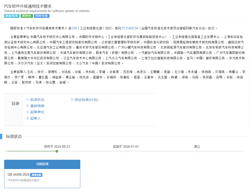 据全国标准公共服务平台显示,国家强制性标准《汽车软件升级通用技术要求》于2024年8月23日正式发布,官方编号:GB 44496-2024,由中华人民共和国工业和信息化部提出并归口,委托TC114SC34(全国汽车标准化技术委员会智能网联汽车分会)执行,将于2026年1月1日正式实施。