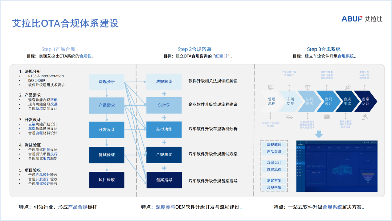 与此同时,艾拉比也将依据国内外法规和标准,基于企业级要求、项目级要求、整车产品要求为客户提供完整的体系建设方案,比如汽车软件全生命周期管理、汽车智能诊断方案、国内外OTA合规性方案以及OTA合规测试、运营等方案和服务,帮助主机厂应对汽车软件升级、安全性、合规性带来的挑战。