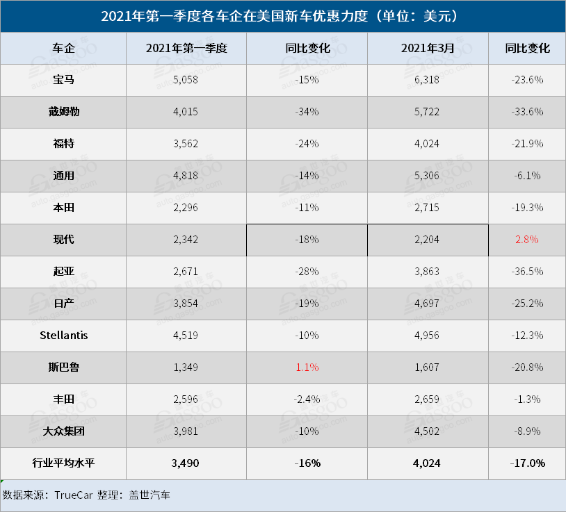 由于新车库存紧张,跨界车、SUV和皮卡的零售需求旺盛,新车折扣继续下降。根据TrueCar的数据,3月份,车企在每辆汽车上的优惠支出平均为4,024美元,同比下降17%;第一季度,车企在每辆汽车上的优惠支出平均为3490美元,同比下跌16%。在所有主要汽车制造商中,只有斯巴鲁在第一季度花费了更高的激励支出,而现代汽车是唯一一家3月份增加折扣的公司。